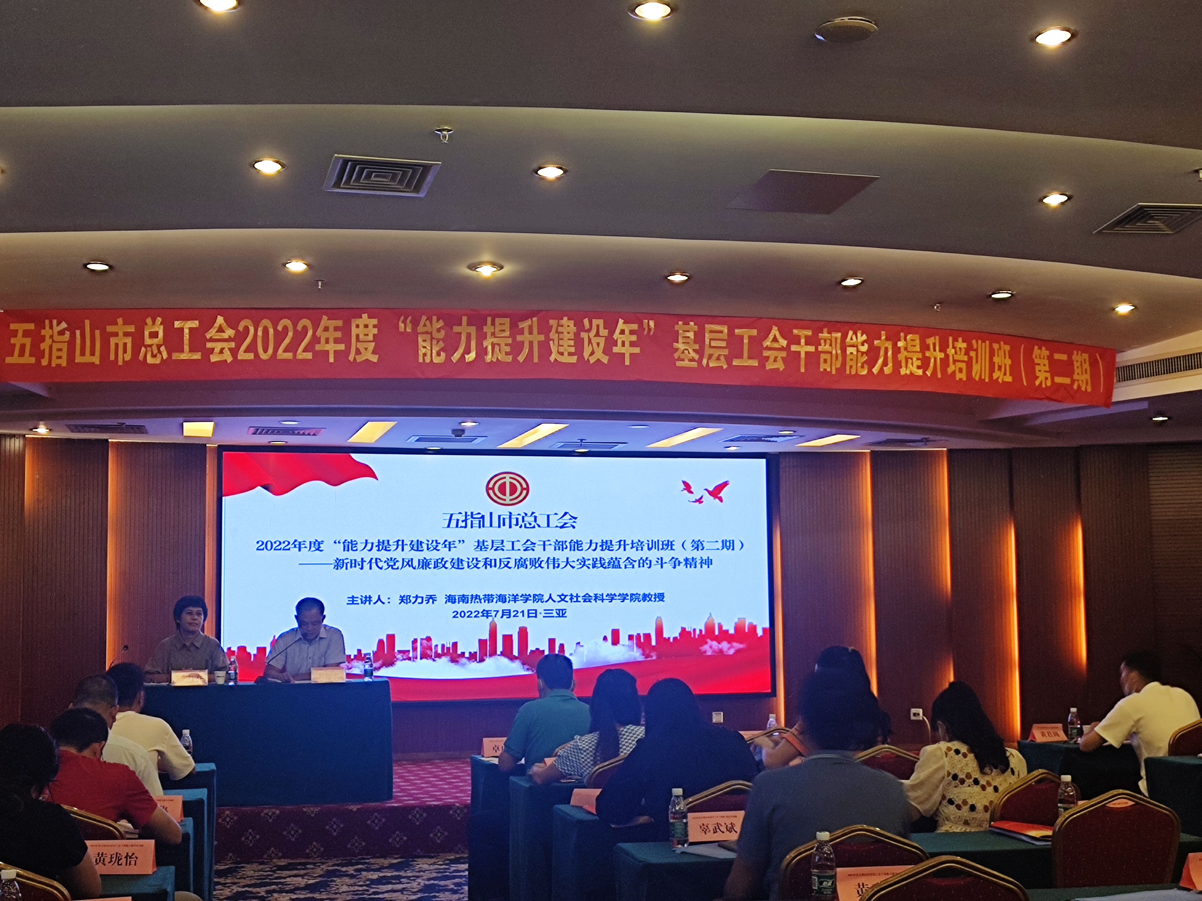 7月21日下午,yl9193永利集团党委书记郑力乔教授应邀为五指山市总工会“能力提升建设年”基层工会干部能力提升培训班(第二期)做辅导讲座,讲座题为“新时代党风廉政建设和反腐败伟大实践蕴含的斗争精神”,五指山市总工会基层干部53人参加了培训,培训以“理论+案例”形式开展,现场培训效果良好,授课获得培训学员的一致好评。