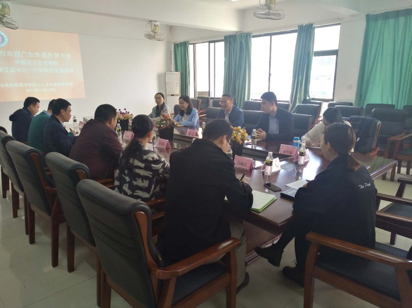 2017年12月19日上午,广东外语外贸大学中国语言文化学院李江副书记一行五人到我院考察交流。我院党委书记钟有桩、党委副书记符昌昭、全体辅导员和校学工处学生教育科副科长关华参加交流。