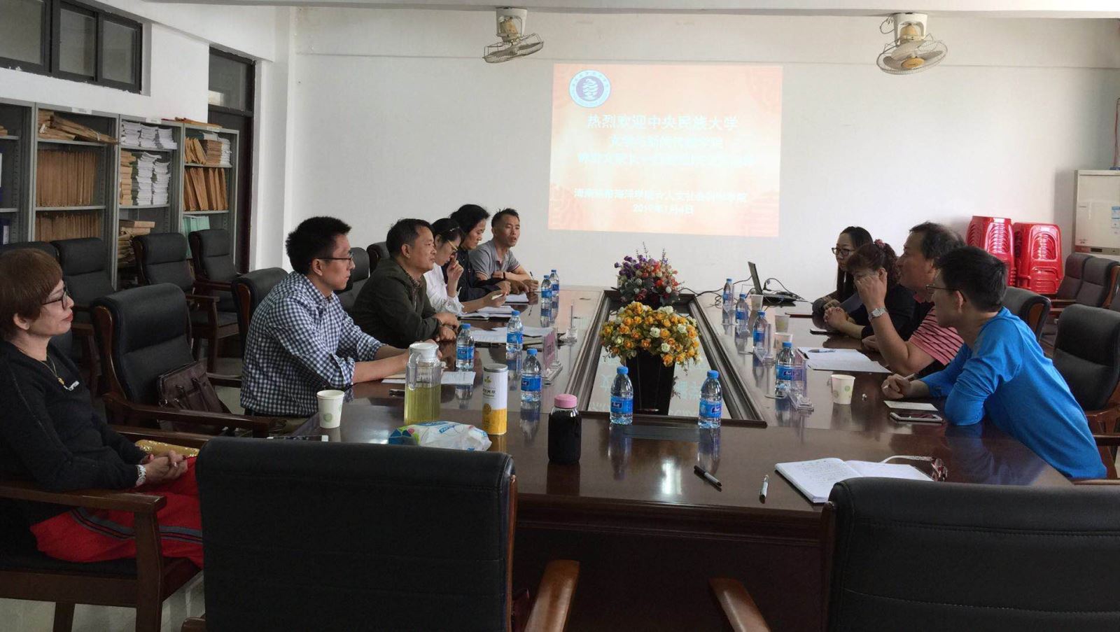 方礼刚副院长代表学院向来访的中央民族大文学与新闻传播学院钟进文院长一行表示欢迎,并就我院的基本情况进行简要介绍。钟进文院长就此次来访我校考察交流的目的进行说明。他希望通过学术交流,召开相关会议,开展民族文化、民族语言的研究,共同探索中国语言学科建设,拓宽两院校之间办学思路,实现优势互补,联合建设硕士点等,并就中国语言文学学科硕士点建设、申报的经验和做法提出宝贵的意见。