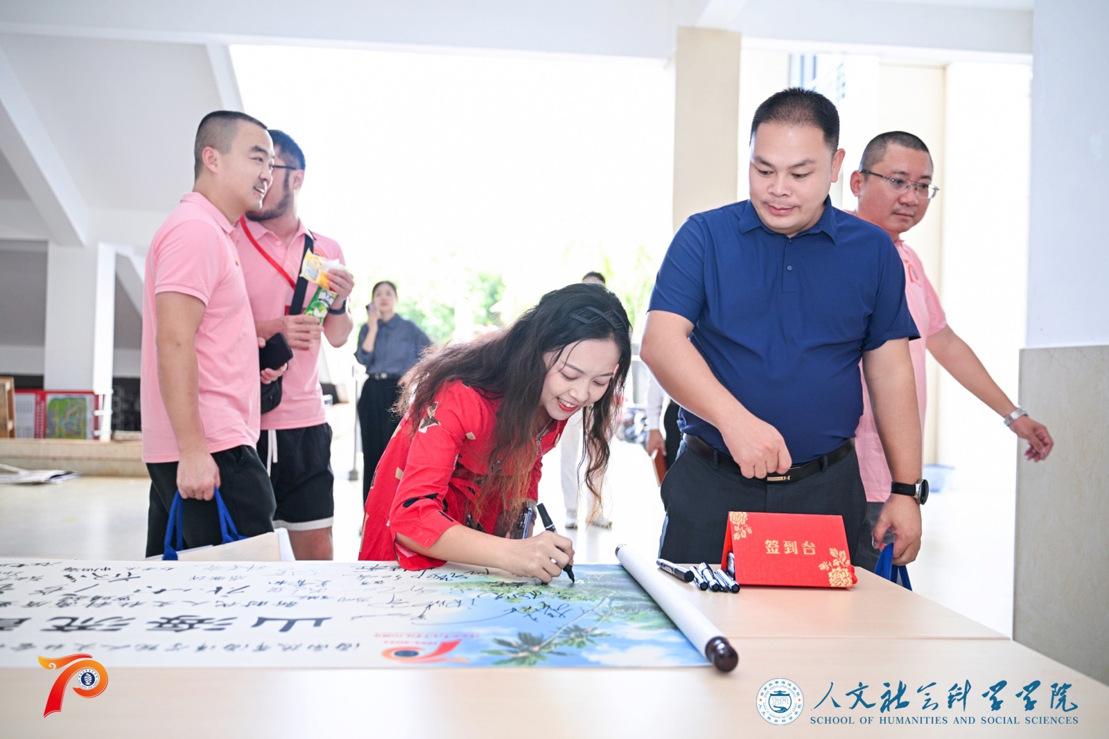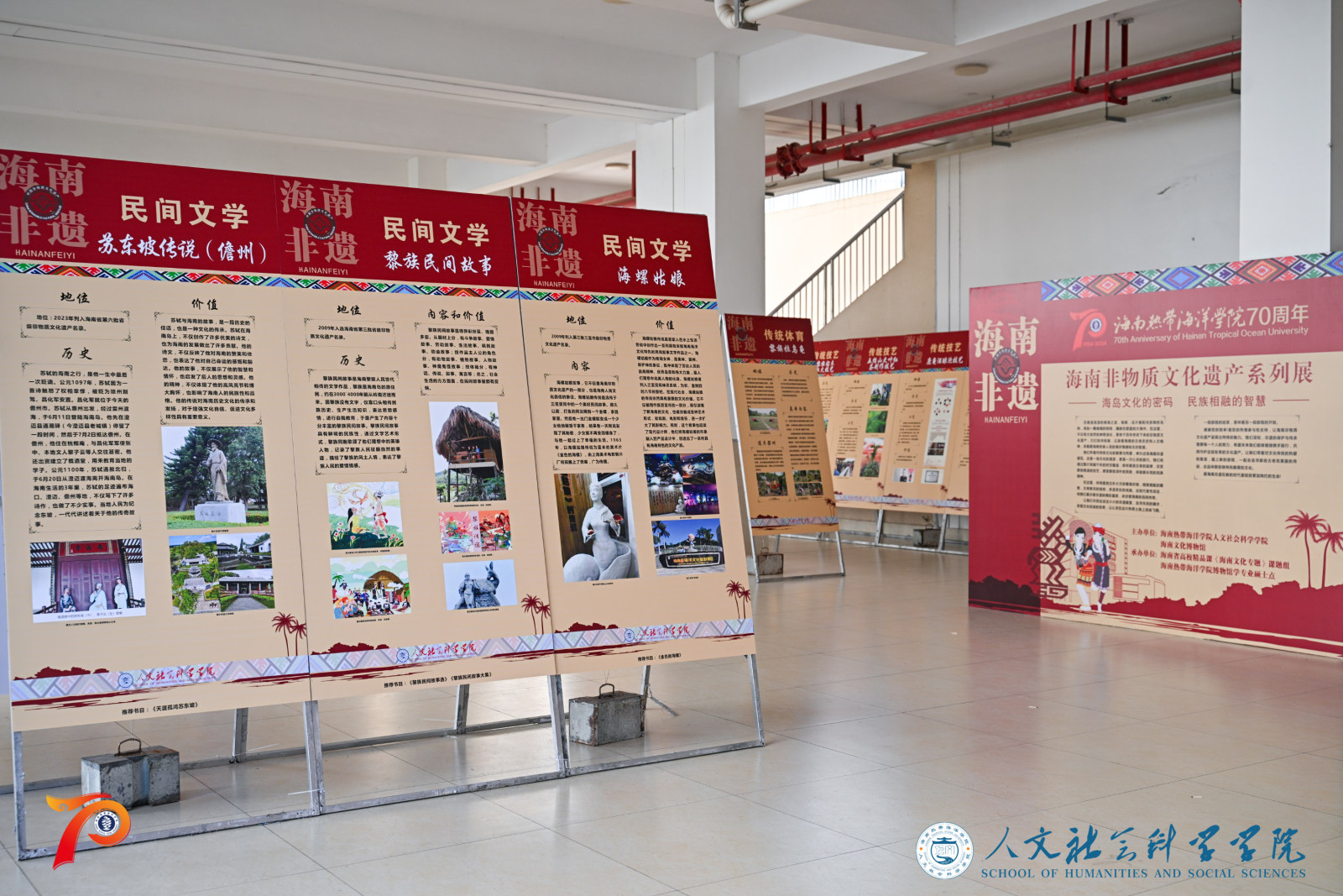 第二部分是由本校首届文物与博物馆专业研究生及其指导教师携手打造的海南非物质文化遗产系列展。展览深度探寻了海南本土非物质文化遗产,借助精巧构思的展板陈列,将海南非遗的独特韵致与深邃底蕴展露无遗。从古朴的黎族织锦工艺到神秘的苗族蜡染技法,从传统的椰雕匠心到热闹非凡的“三月三”民族节庆,每一项非遗都似在低吟海南这片热土的往昔传奇,传递先辈的聪慧情思,有力彰显学院于文化传承创新领域的使命担当与专业实力。