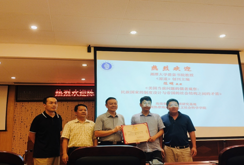 2021年5月8日下午,湘潭大学碧泉书院教授、《原道》(CSSCI)创刊主编陈明教授,应yl9193永利集团国际事务与国际关系系、海南省南海文明研究基地之邀,在图书馆报告厅作题为《美国当前问题的儒者观察:民族国家的制度设计与帝国的社会结构之间的矛盾》的学术讲座。