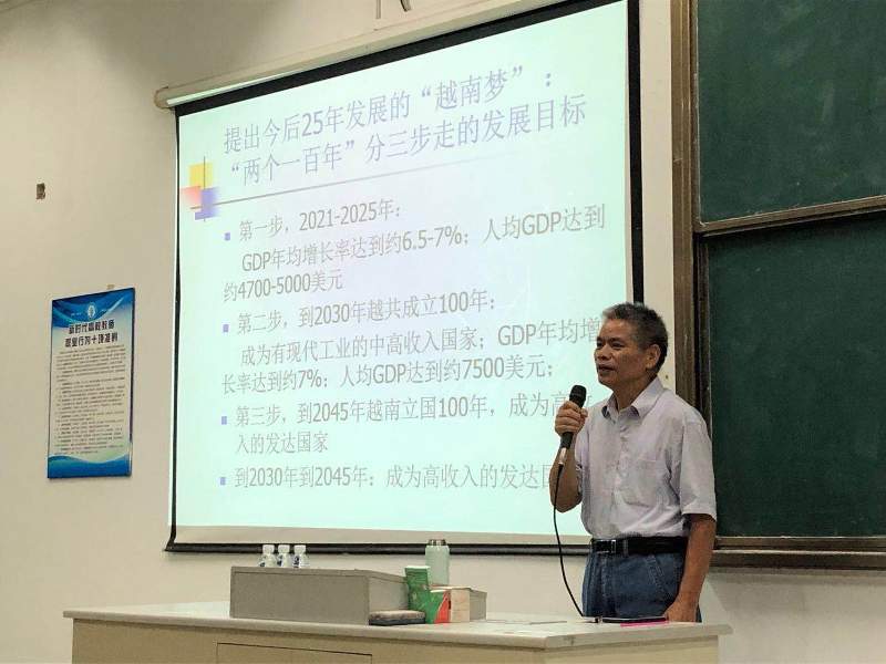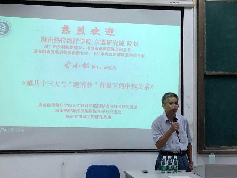 “学史明理、学史增信、学史崇德、学史力行”,这是迎接建党100周年之际,习近平总书记对“学党史、悟思想、办实事、开新局” 学习教育活动的殷切倡议。响应这一时代号召,6月3日晚,永利集团东盟研究院院长古小松应人文社科学院、海南省南海文明研究基地之邀在4206作题为《越共十三大与“越南梦”背景下的中越关系》的讲座。讲座的举办得到了国际合作与交流处的支持。讲座由国际事务与国际关系专业负责人黄田园主持,人文社科学院副院长方礼刚、国际合作与交流处处长邓颖颖出席,人文社科学院及海南省南海文明研究基地的师生近200人参加本次讲座。