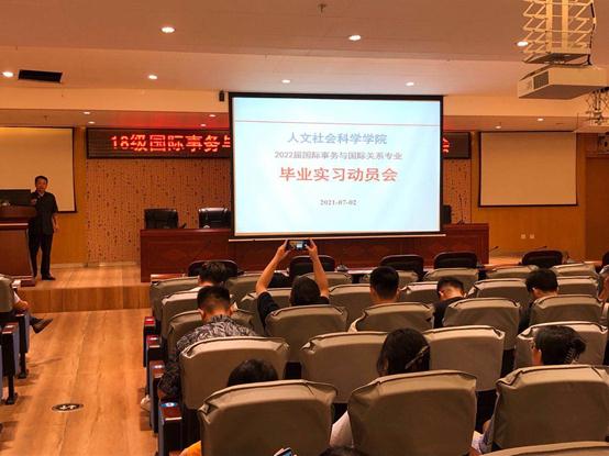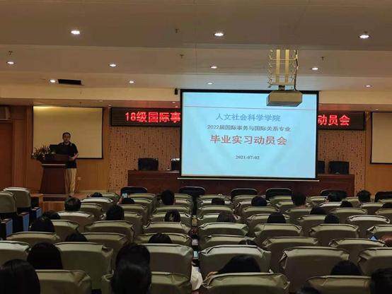 国际事务与国际关系专业于7月2日晩图书馆负一层报告厅召开18国关毕业实习动员大会,18国关的59名同学全部参加。会议由国际事务与国际关系专业负责人黄田园主持,人文社科学院党委副书记符昌昭、副院长方礼刚到会并同学生亲切交谈,国际事务与国际关系专业教师肖玮、张逢博、蔡志鸿等出席,现场气氛热烈,同学们积极听讲、认真记录。