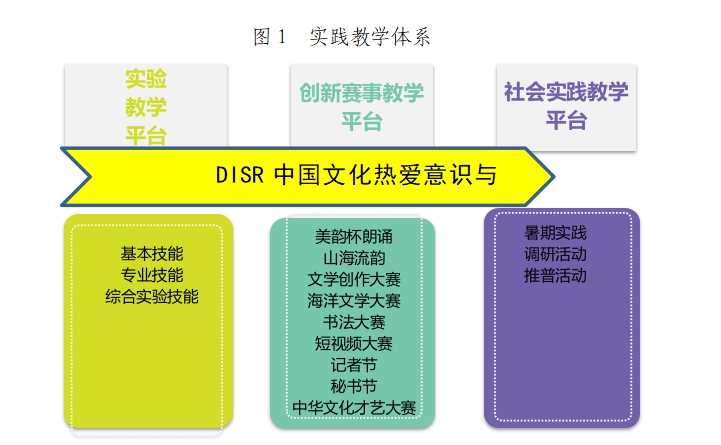 本实验教学中心注重构建“DISR”实践教学体系,即全程贯穿对学生的中国语言文字的热爱(devotion)、传承(inherit)、传播(spead)、研究(research)自主意识的培养。通过搭建实验教学平台、社会实践教学平台、创新赛事三大教学平台,着力培养学生对中国语言文字的创新传承传播研究能力。