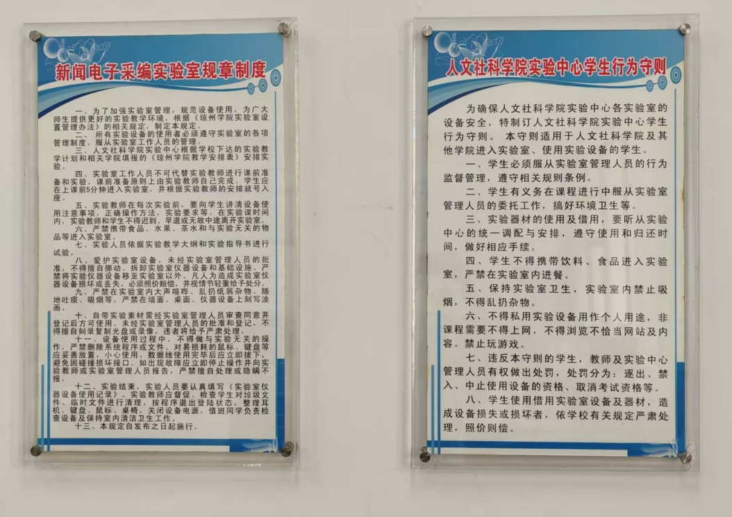 实验中心严格执行相关实验教学与管理制度,并完善了主要教学环节的质量标准,相应制度有《实验中心管理制度》、《实验室安全管理制度》、《实验中心实验课程(指导)教师职责》、《实验中心学生行为守则》、《实验技术人员岗位职责》、《实验指导教师职责》、《学生实验守则》等文件,这些制度措施保证了教学过程平稳。
